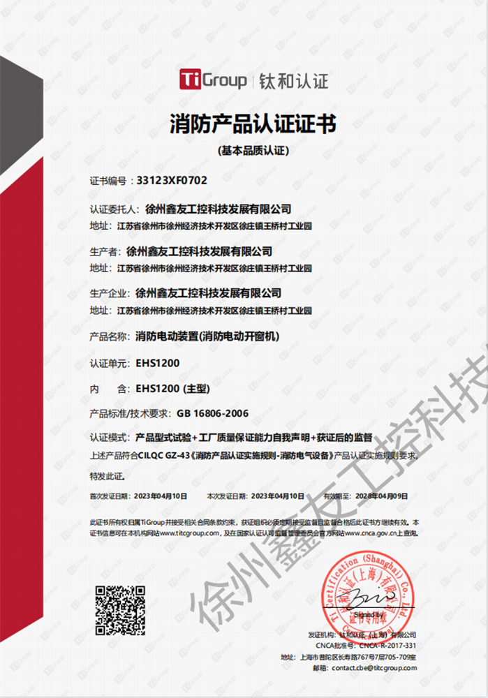 徐州鑫友工控科技發(fā)展有限公司成立于2008年,占地31600平方米,全資子公司:江蘇良紫工程科技有限公司,旗下 有“鑫友”及“MASTER.W主人窗控”兩個品牌系列,公司全面貫徹執(zhí)行IS09001:2015質(zhì)量管理體系標(biāo)準(zhǔn),產(chǎn)品順利通過歐盟CE認(rèn)證和中國***消防電子產(chǎn)品認(rèn)證,通過可燃性粉塵環(huán)境下、爆炸性環(huán)境下防爆合格產(chǎn)品檢驗。排煙天窗整窗通過***消防產(chǎn)品質(zhì)量監(jiān)督檢驗中心檢測。先后獲得多項******及榮譽證書。集研發(fā)、加工、生產(chǎn)、制造、銷售、安裝及售后于一體,是一家高起點、研發(fā)能力強的專業(yè)智能化企業(yè)。